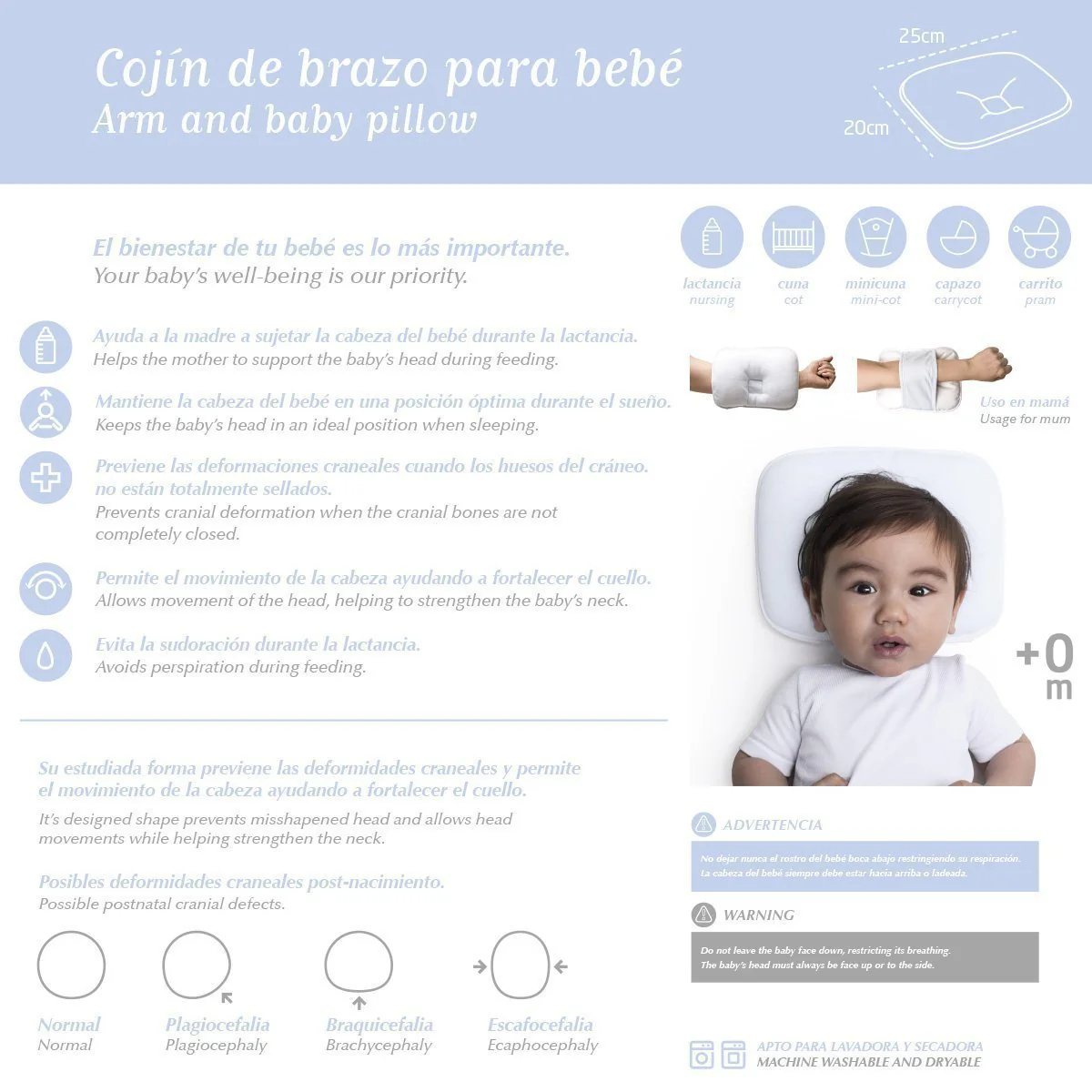El cojín de brazo y de bebé de Cambrass Farma tiene una doble utilidad tanto para la madre como para el bebé. Por una parte, como cojín de brazo, ayuda a la madre a sujetar de forma suave la cabeza del bebé durante la lactancia (tanto natural como con biberón), absorbiendo los sudores que se producen al entrar en contacto la piel. Por otra parte, como cojín de bebé, mantiene la cabeza del bebé en una posición óptima durante el sueño o el descanso (tanto cara a arriba como ladeado).