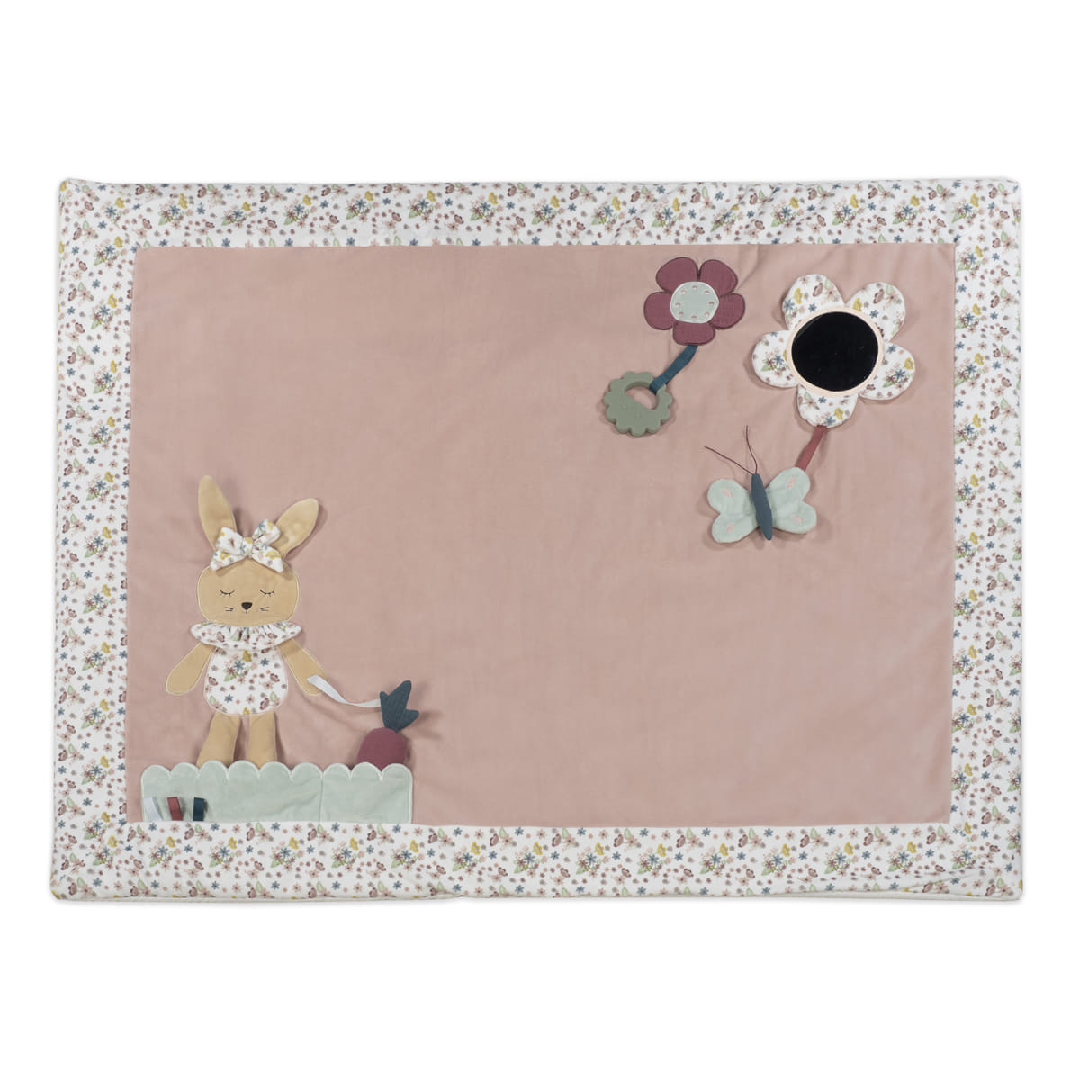 La manta de gateo con actividades con conejito en rosa es el complemento perfecto para estimular y entretener a tu bebé mientras explora su entorno. Diseñada con detalles encantadores y funciones interactivas. Esta manta proporciona un espacio seguro y divertido para que tu pequeño desarrolle sus habilidades motoras y sensoriales. Confeccionada en suave velour ofreciendo una superficie cómoda y segura para que el bebé se mueva libremente, fomentando su independencia y capacidad de exploración. Incluye diversas actividades como una flor con espejo, un mordedor y diferentes texturas que fomentan la curiosidad y el juego imaginativo. Las texturas variadas y los elementos interactivos ayudan a desarrollar las habilidades sensoriales y motoras finas del bebé. Amplia superficie que proporciona suficiente espacio para que el bebé gatee y juegue. Ideal para usar en cualquier habitación de la casa. El diseño y los colores neutros hacen que esta manta se integre perfectamente con la decoración de cualquier hogar, añadiendo un toque de ternura y diversión. Esta manta de gateo con actividades de Pasito a pasito es una elección ideal para padres que buscan un producto versátil y estimulante para sus bebés. Proporciona un entorno seguro y acogedor donde los pequeños pueden desarrollar sus habilidades y disfrutar de horas de diversión. Fácil de plegar y transportar por su bolsa de transporte. Perfecta para llevar a casa de los abuelos, al parque o de vacaciones. Limpieza a mano o a máquina a 30 °C. Un regalo perfecto para acompañar el crecimiento y descubrimiento de tu bebé. Pasito a pasito protege a tu bebé utilizando los mejores tejidos, libres de colorantes azoicos y sustancias nocivas para la salud. De fácil limpieza a mano o a máquina a 30 °C. Cumple con la normativa europea EN-71 Seguridad de los juguetes +0 años. Medidas 100×80 cm.