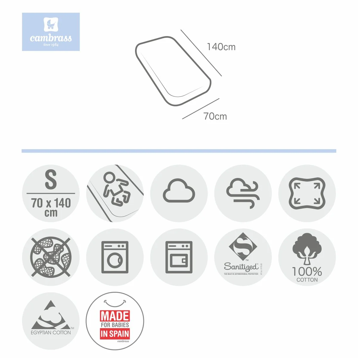 La sábana ajustable para cuna 70 de Cambrass funciona como una práctica bajera al adaptarse al colchón por los laterales con su goma elástica. Su fabricación con algodón egipcio 100% y el tratamiento Sanitized garantiza su higiene ya que ofrece una protección antimicrobiana duradera que evita el desarrollo de bacterias y hongos así como los malos olores.