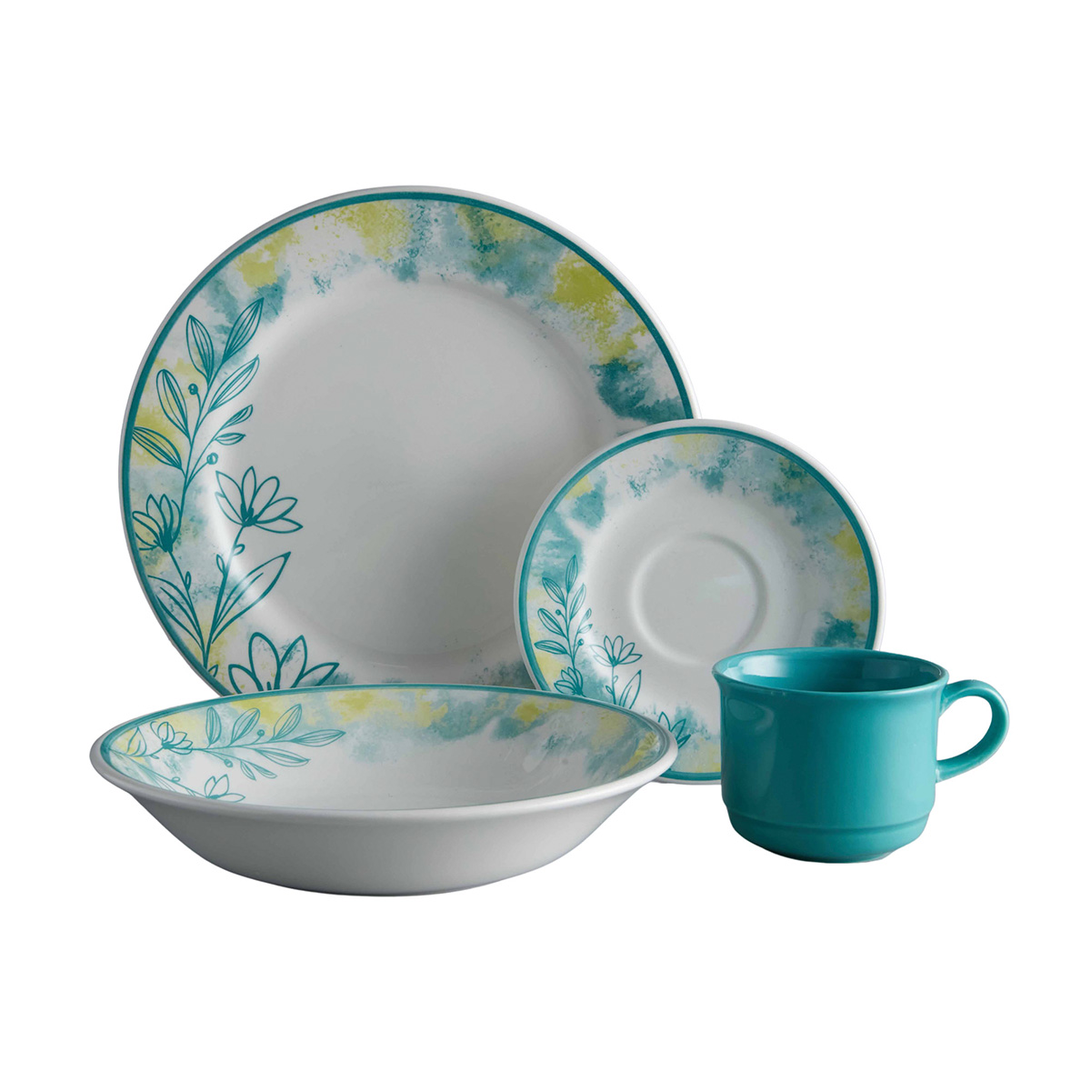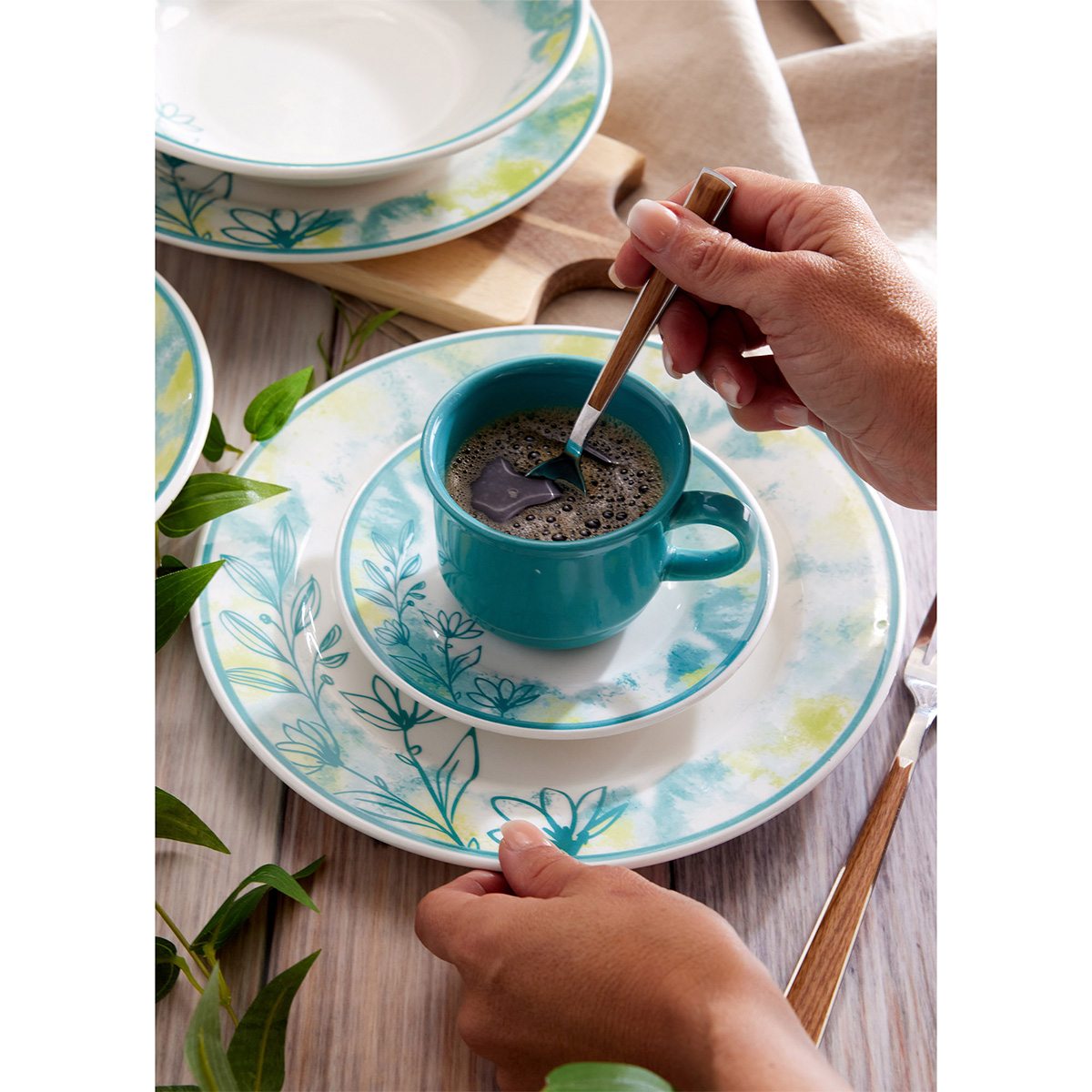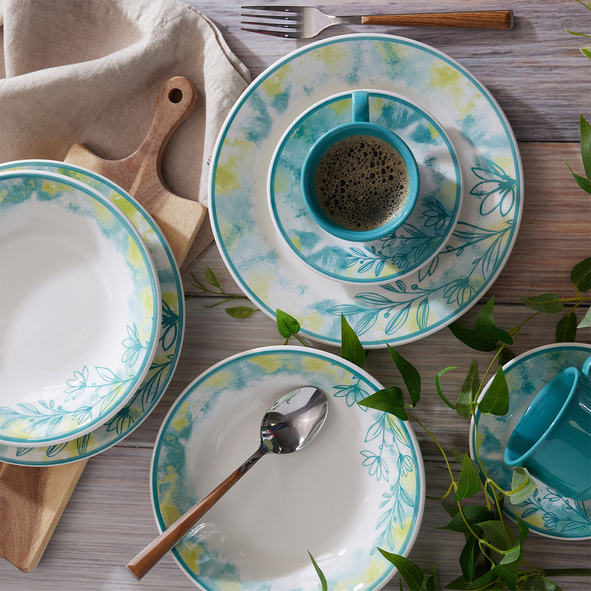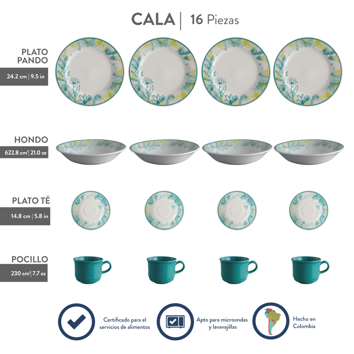 La Vajilla Corona Cala de 4 puestos y 16 piezas evoca suavidad, tranquilidad y equilibrio con una combinación de colores que aportará un toque especial a tu mesa.
