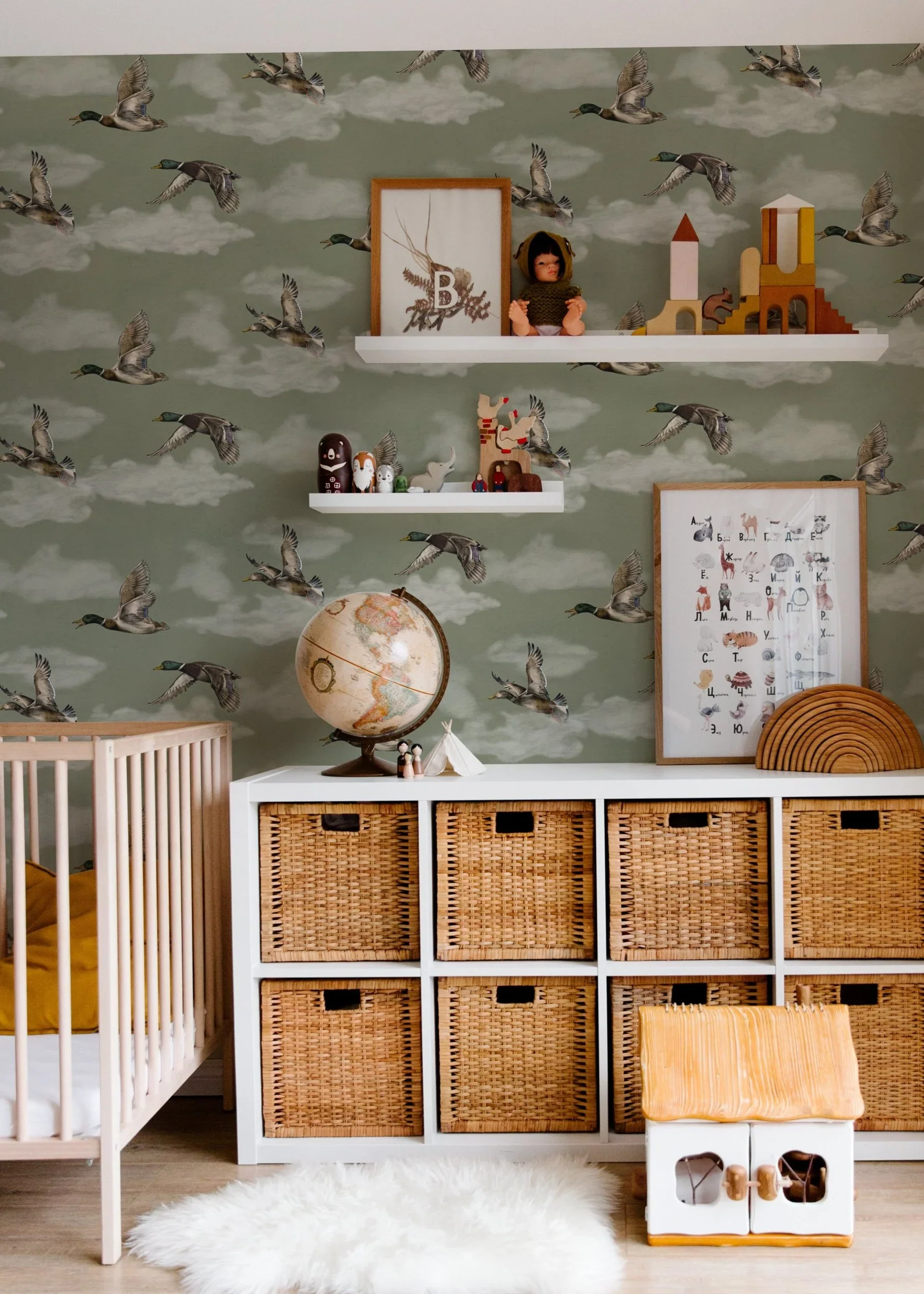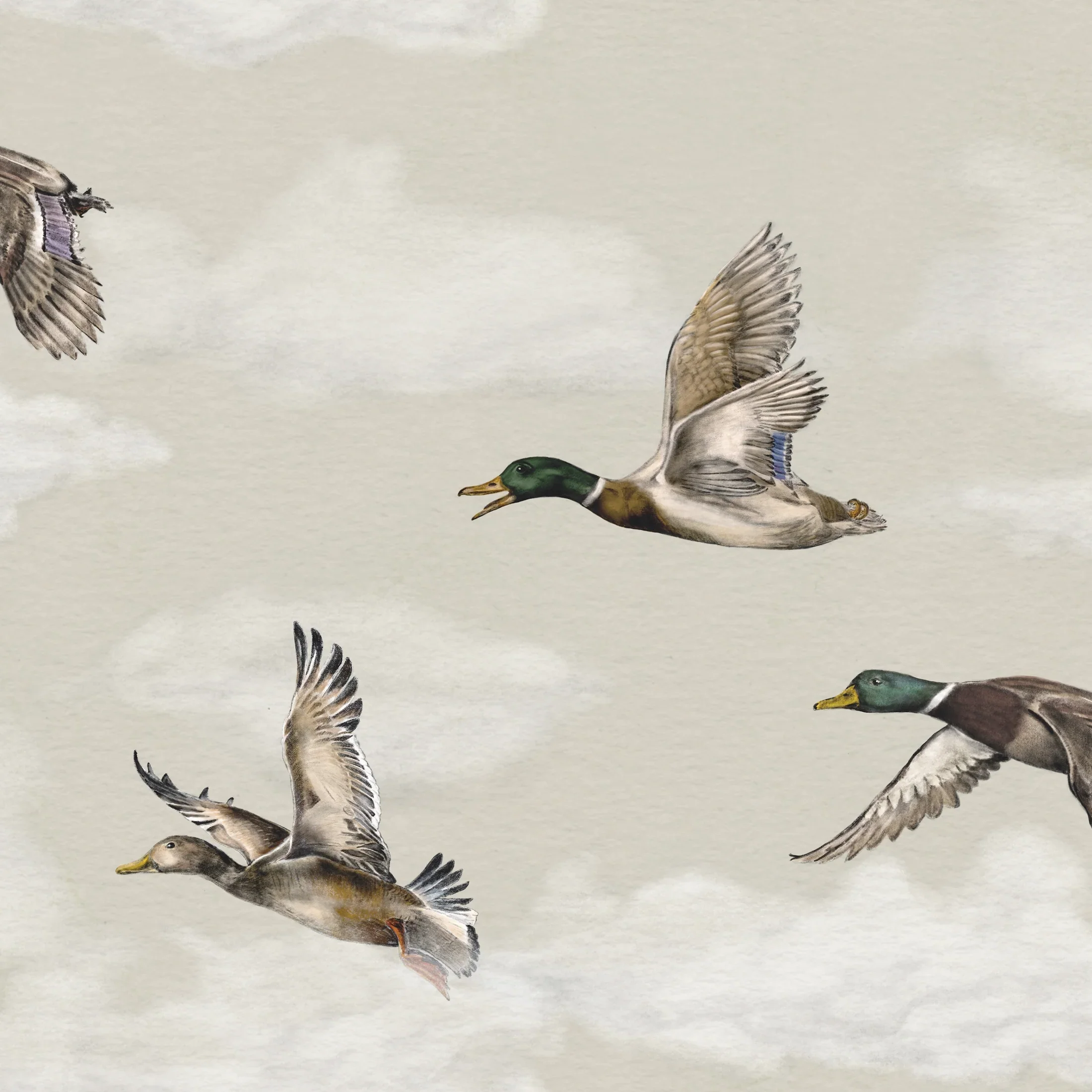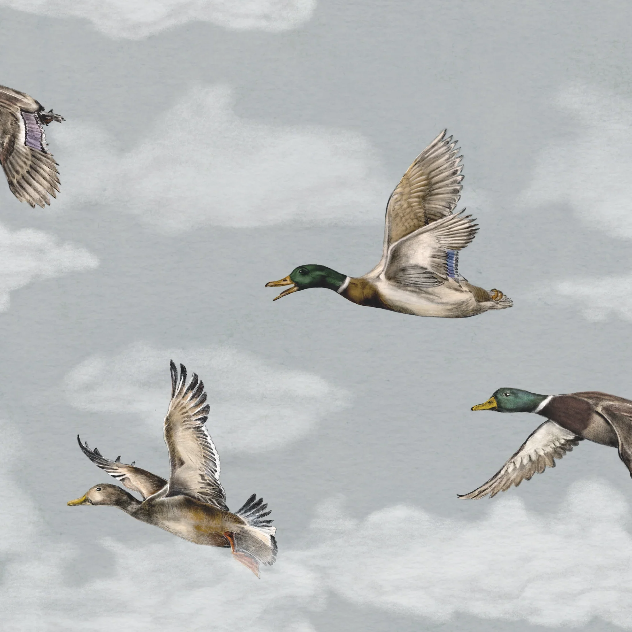 Añade un aire sereno y de inspiración natural a tus paredes. Patos que surcan suaves nubes en un diseño ilustrado con delicadeza, que aporta movimiento y calma a cualquier estancia. Disponible en cuatro tonalidades elegantes.