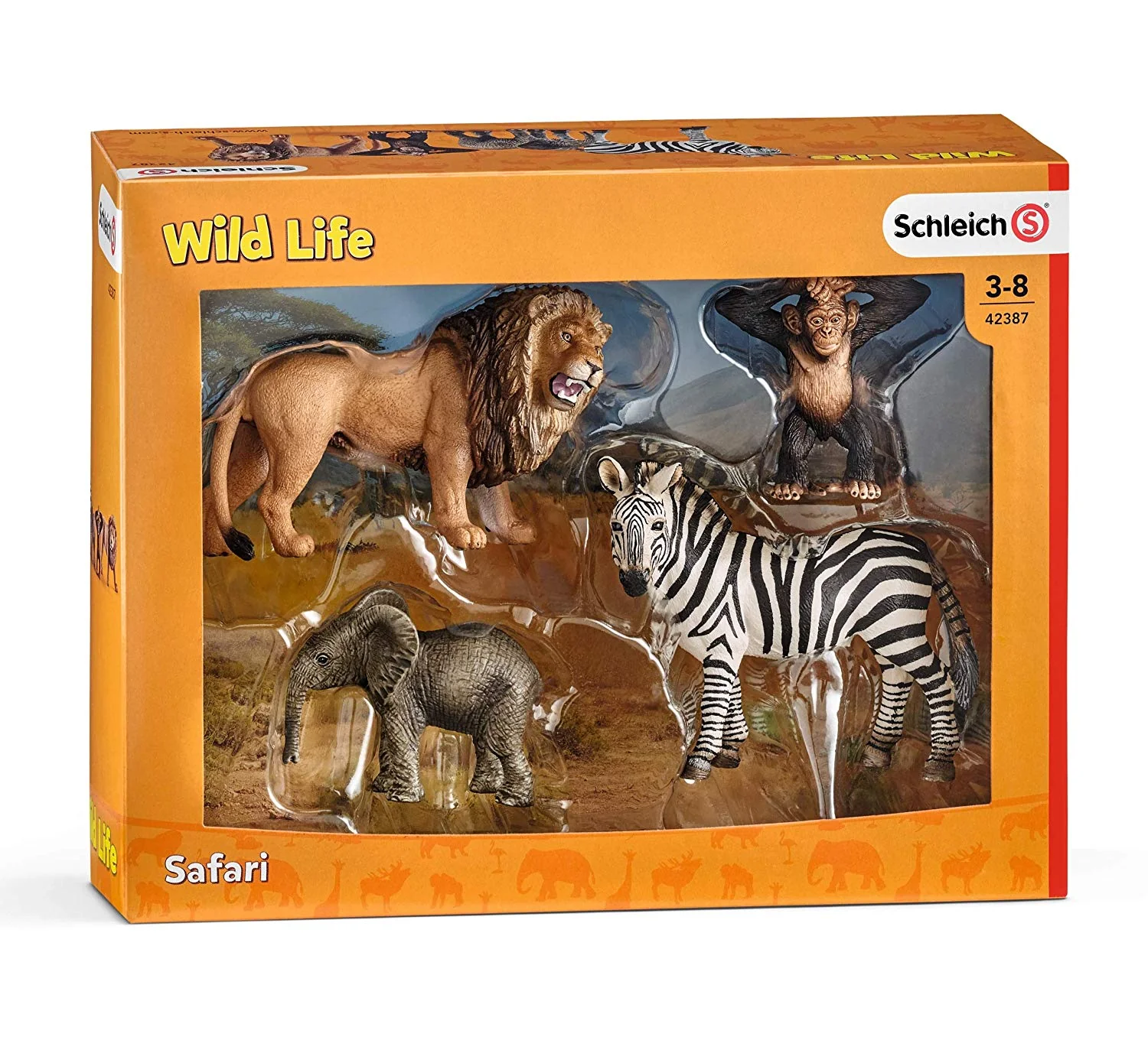 - Contenido de la caja: 1 león, 1 cebra, 1 chimpancé y 1 cria de elefante africano.