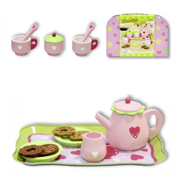 - Juego de té de madera de color rosa.